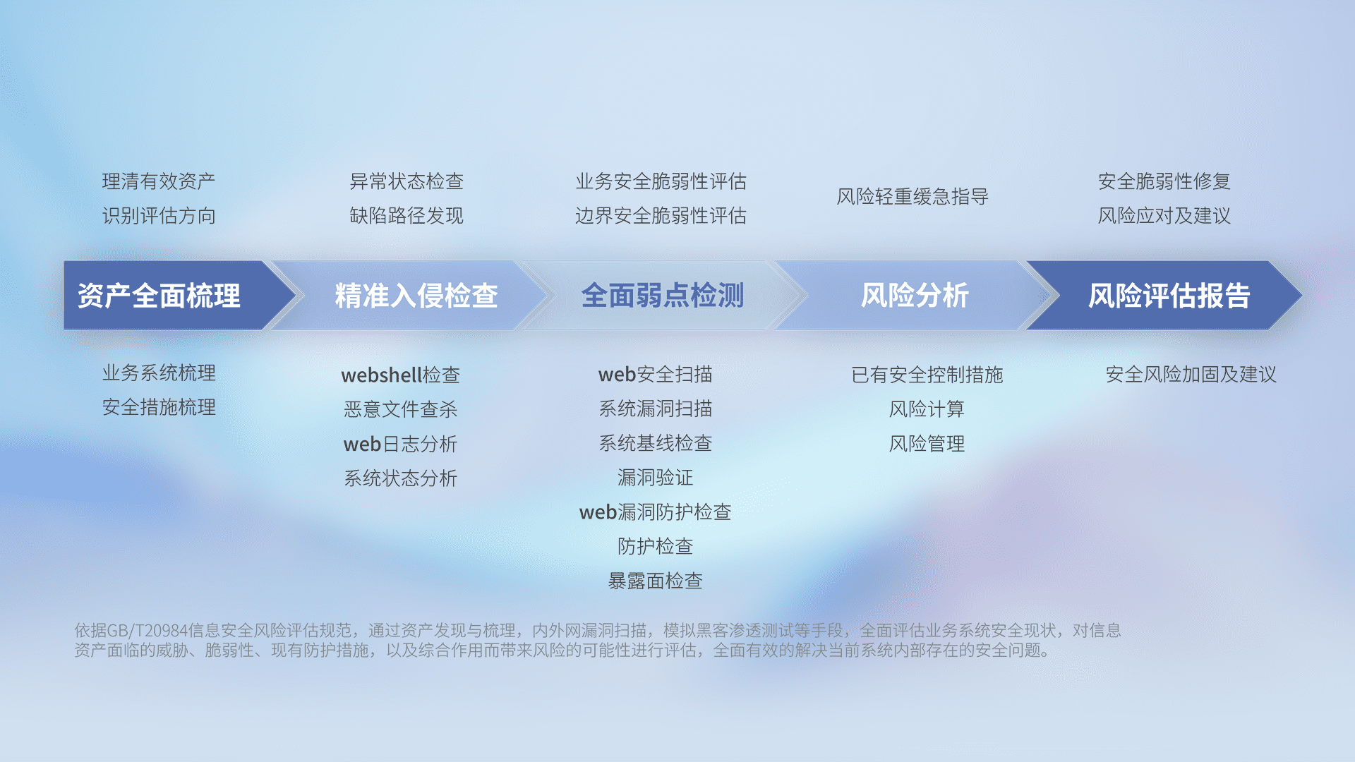 针对客户行业特性,,,,以专业的安全服务+多厂商联合解决方案提供专属的一站式安全管理服务,,,帮助客户全面感知网络空间威胁,,,,基于识别、、、检测、、、、分析、、防护、、、、监测、、、响应的服务理论模型,,,从方案咨询、、、、集成交付、、、评估验证、、、、优化加固、、、运维运营,,,致力于为客户提供完整的闭环管理式安全服务。。。以实战经验为客户打造高抵御风险的安全体系,,帮助客户发现威胁、、、、对抗威胁、、、、处置威胁,,,不断积累安全对抗能力,,,,持续保障数字化安全。。